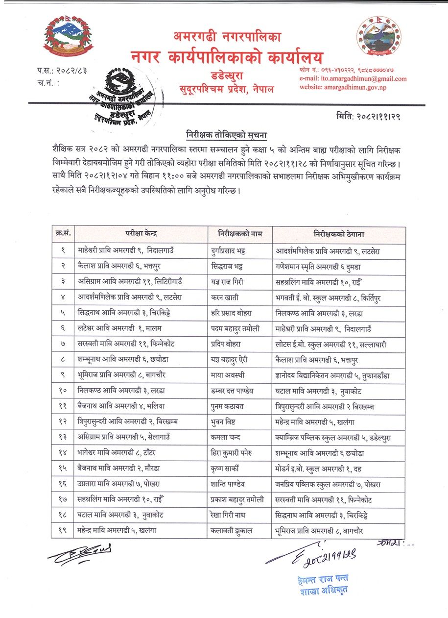 निरीक्षक तोकिएको सूचना ।।।।