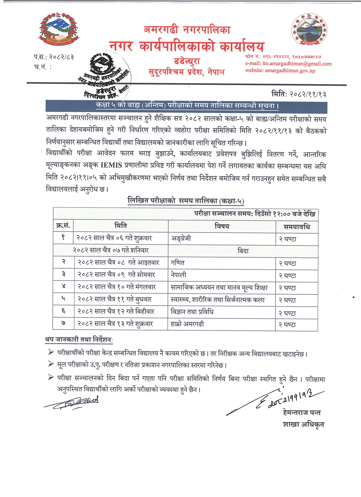 कक्षा ५ र आधारभूत शिक्षा उत्तीर्ण परिक्षाको समय तालिका सम्वन्धि सूचना ।।।