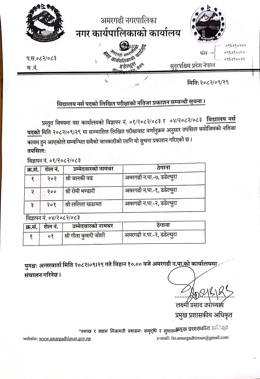 विद्यालय नर्स पदको लिखित परिक्षाको नतिजा प्रकाशन सम्वन्धि सूचना ।।